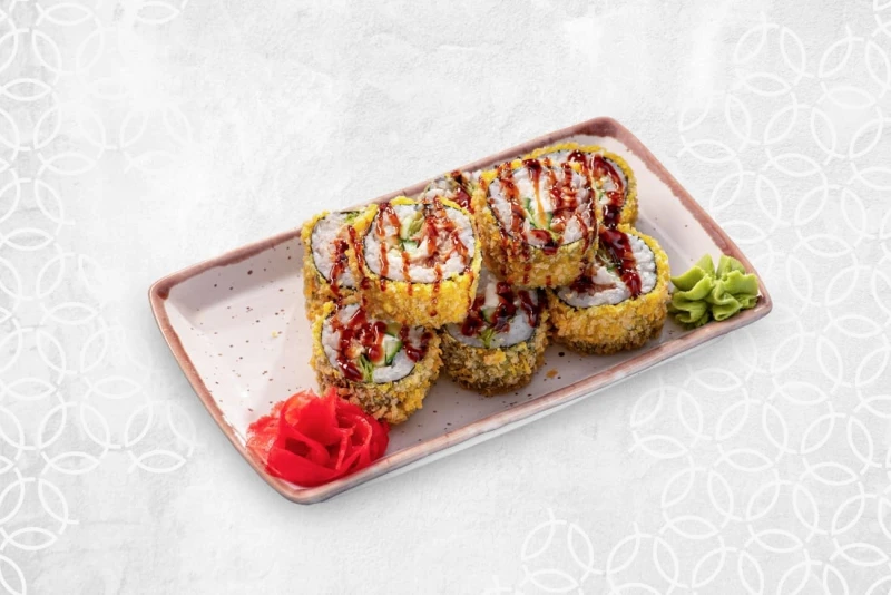 Рис, нори, огурец,сыр сливочный, угорь, салат айсберг, кляр темпура, спайси соус, соус унаги, кунжут
