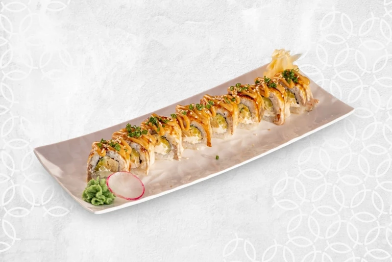 Рис, нори, угорь ,сыр творожный, омлет японский, огурцы, соус сливочный унаги, кунжут, лук зеленый
