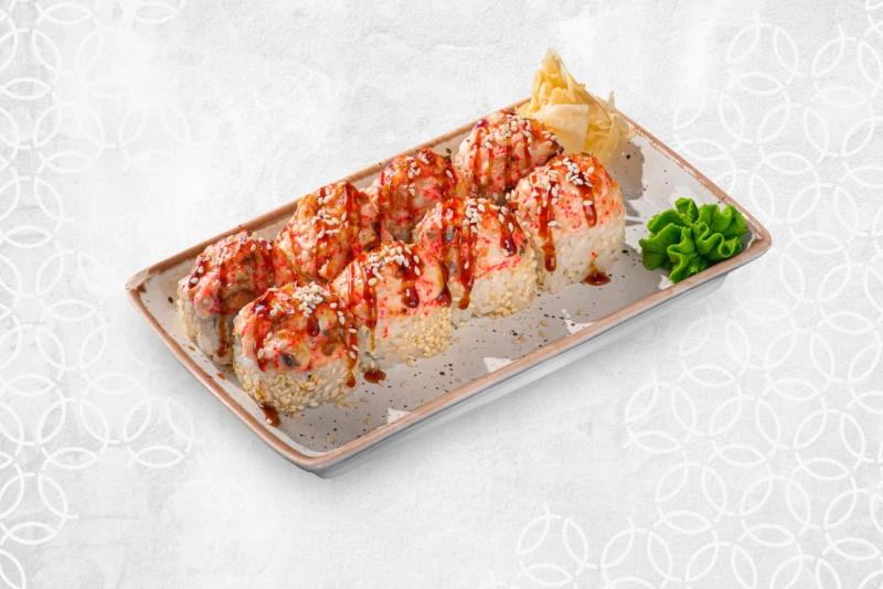 Рис, нори, кунжут, лосось,слабосоленый, творожный сыр, авокадо, сыр моцарелла, шапка из угря, икра тобико, унаги соус