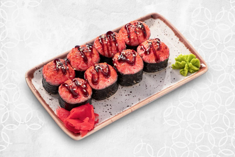 Рис, нори, соус сырный, огурец, соус унаги, лосось, гребешок, кунжут